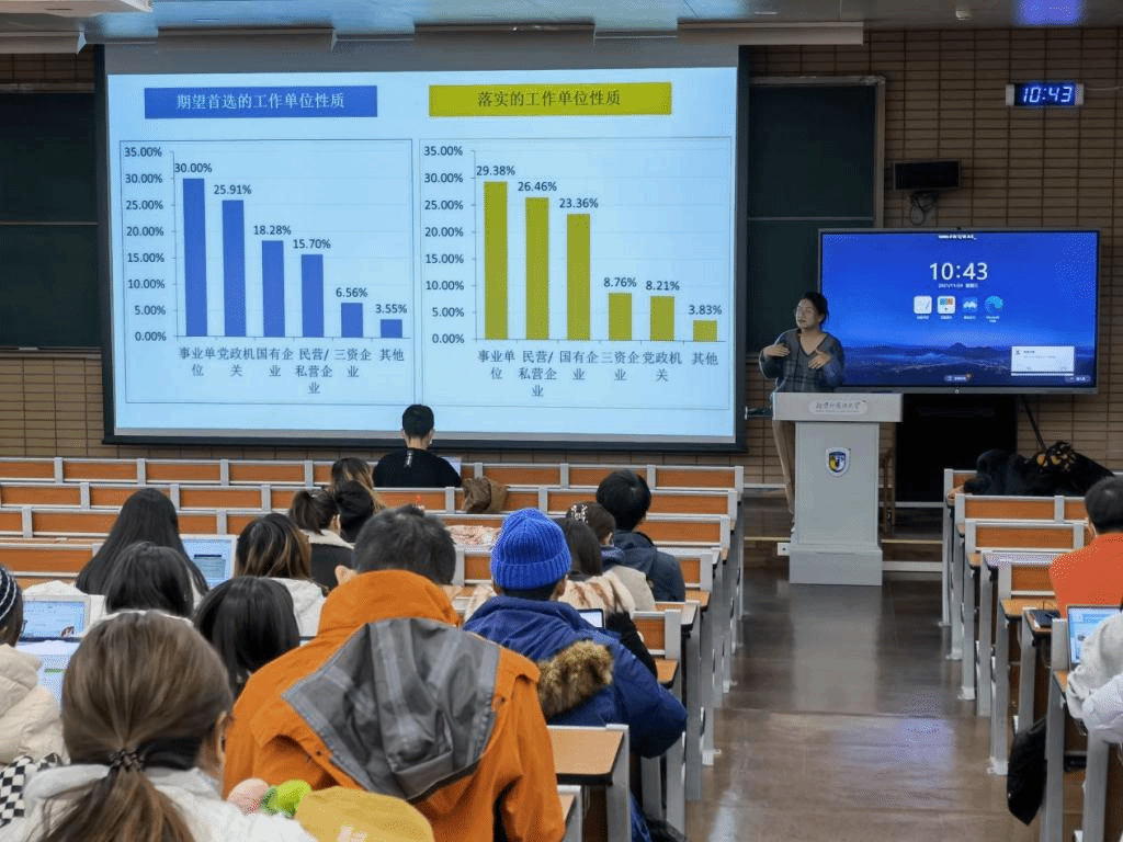 11月24日上午,beat365官方网站2022届就业形势与政策介绍讲座于逸夫楼一阶教室顺利召开。国际商学院辅导员、校生涯规划课程教研室成员谭佳琳老师作为主讲人,为beat365官网本科和硕士高年级学生介绍近五年来学校和beat365官方网站整体就业情况,以及今年的就业形势与政策。