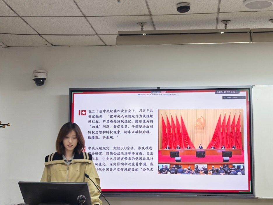 2025年4月9日晚,法律硕士党支部在中文楼123教室召开了一次以“深入学习中央八项规定精神,推动作风建设常态化长效化”为主题的党课学习会。本次会议由支部书记郝雨辰领学,全体党员参会。本次主题学习会主要围绕中央八项规定精神的背景、核心内容、实施成效及贯彻落实等方面展开深入学习与讨论,进一步强化了党员的纪律意识和作风建设责任感。