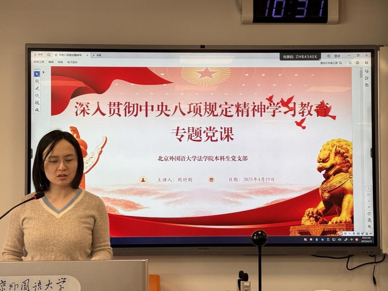 为引导党员树立正确的价值观,强化党员作风建设与廉洁自律意识,2025年4月19日上午,beat365官方网站本科生党支部于逸夫楼303教室组织开展了“深入贯彻中央八项规定精神学习教育”专题学习活动。本次党课由beat365官方网站辅导员、本科生党支部书记刘时剑同志主讲,支部党员、预备党员及发展对象参加学习。