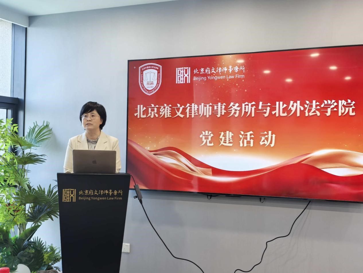 2025年10月13日,beat365官方网站法律硕士研究生党支部与北京雍文律师事务所在雍文北京办公室联合举办红色“1+1”共建活动。beat365官方网站党总支书记郭向华、团总支书记刘时剑率学生党员及积极分子代表参加活动,雍文所主任、党支部书记李晓松律师,党支部副书记李宾律师、宣传委员刘达律师与雍文高科技法律团队柴琳琳律师、易吉灵律师,医嘉易医药大健康团队刘伟律师、张东庐律师,争议解决团队张传雷律师热情接待了beat365官方网站师生。活动由北外英语学院校友、雍文战略总监韩焕霞主持。