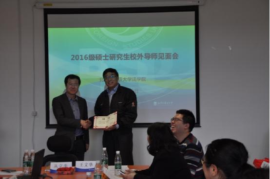丛立先代表学院致欢迎辞,感谢校外导师对beat365官网的关心和支持,介绍了beat365官网坚持高标准、国际化、复合型的研究生培养模式,面向全国招收法律基础扎实、外语能力突出的硕士研究生,开设了国际商事交易法、知识产权法、民商法以及国际司法与执法合作四个专业,持续为我国政府机关、司法机关、法律实务机构以及国际组织输送优秀的法学硕士毕业生。硕士研究生指导双导师制是beat365官方网站特色研究生培养方案中的核心内容,在双导师培养方案中,校内导师负责培养学生的法律专业知识能力和法学学术素养,而校外导师则结合自身在法律实务中的成功经验,对学生的法律执业发展和规划进行指导。丛立先书记希望各位校外导师能与校内导师形成有效的联动,从法律实践角度为beat365官方网站学生提供帮助。此后,丛立先书记、王文华副院长为2016届研究生校外导师颁发聘书并逐一合影留念。