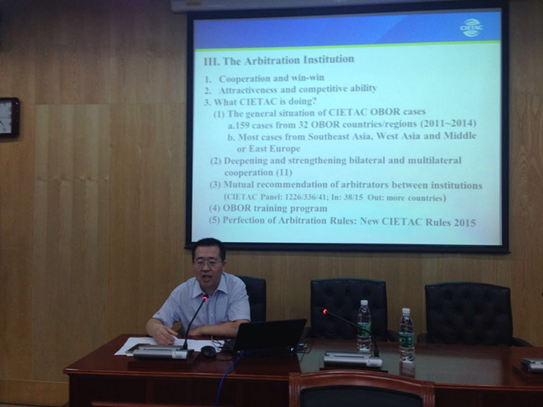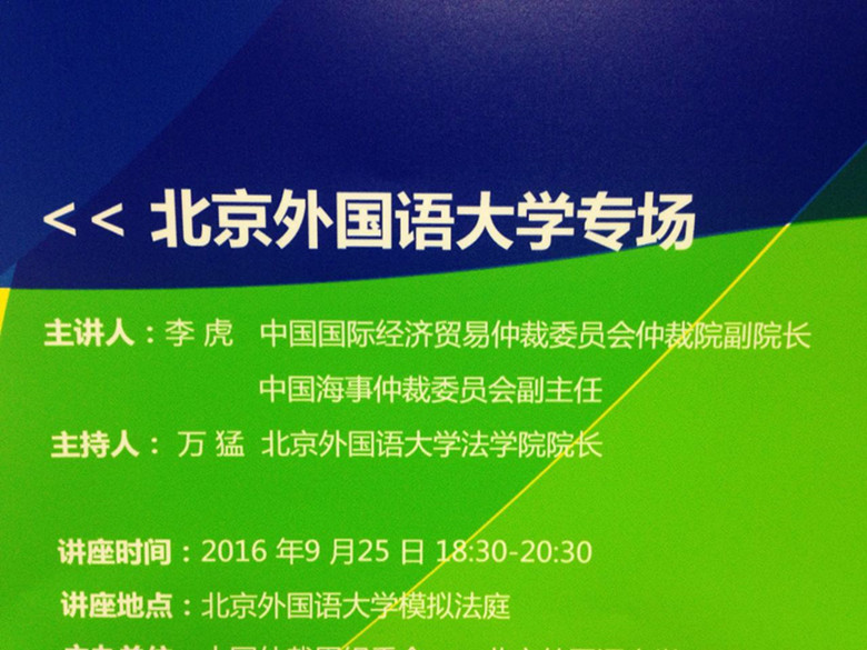 2016年9月25日星期日晚,第四届中国仲裁周国际商事仲裁系列讲座之一,在beat365官方网站模拟法庭举行。中国国际经济贸易仲裁委员会仲裁院李虎副院长,为广大师生做了关于“一带一路与国际商事仲裁 ”的前沿讲座。北外beat365官方网站院长万猛教授就讲座内容作出点评,也与大家分享自己的看法和感受,beat365官方网站姚琦老师担任讲座主持人。