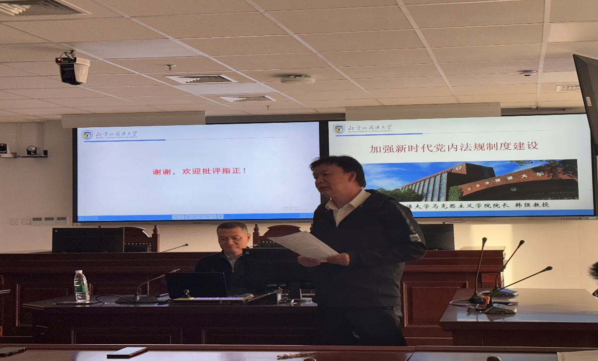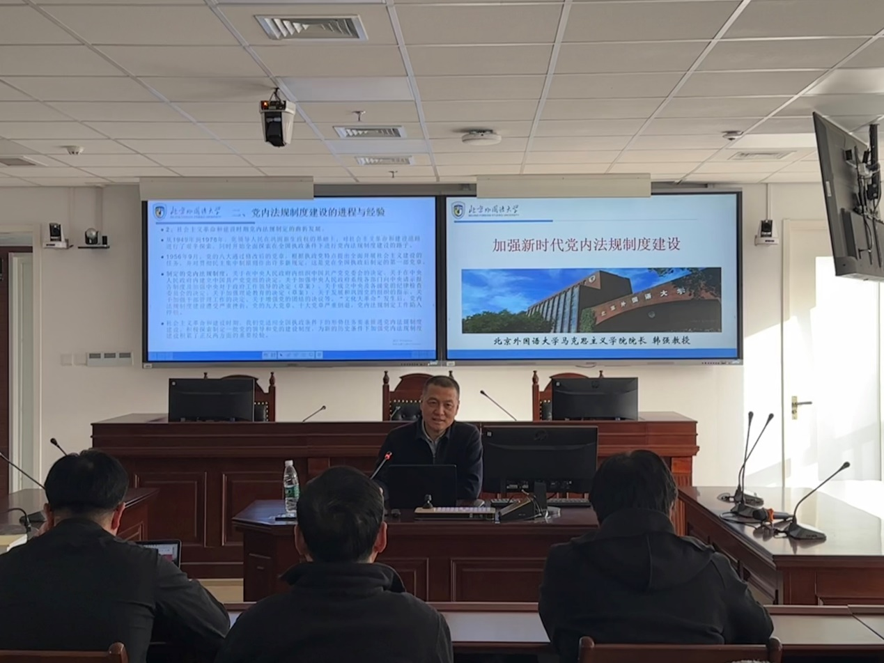 2023年12月6日下午14时,beat365官方网站党总支邀请我校马克思主义学院院长韩强教授以“加强新时代党内法规制度建设”为主题来beat365官网开展专题讲座。beat365官方网站全体教职工参加会议,教工党支部书记董念清主持会议。