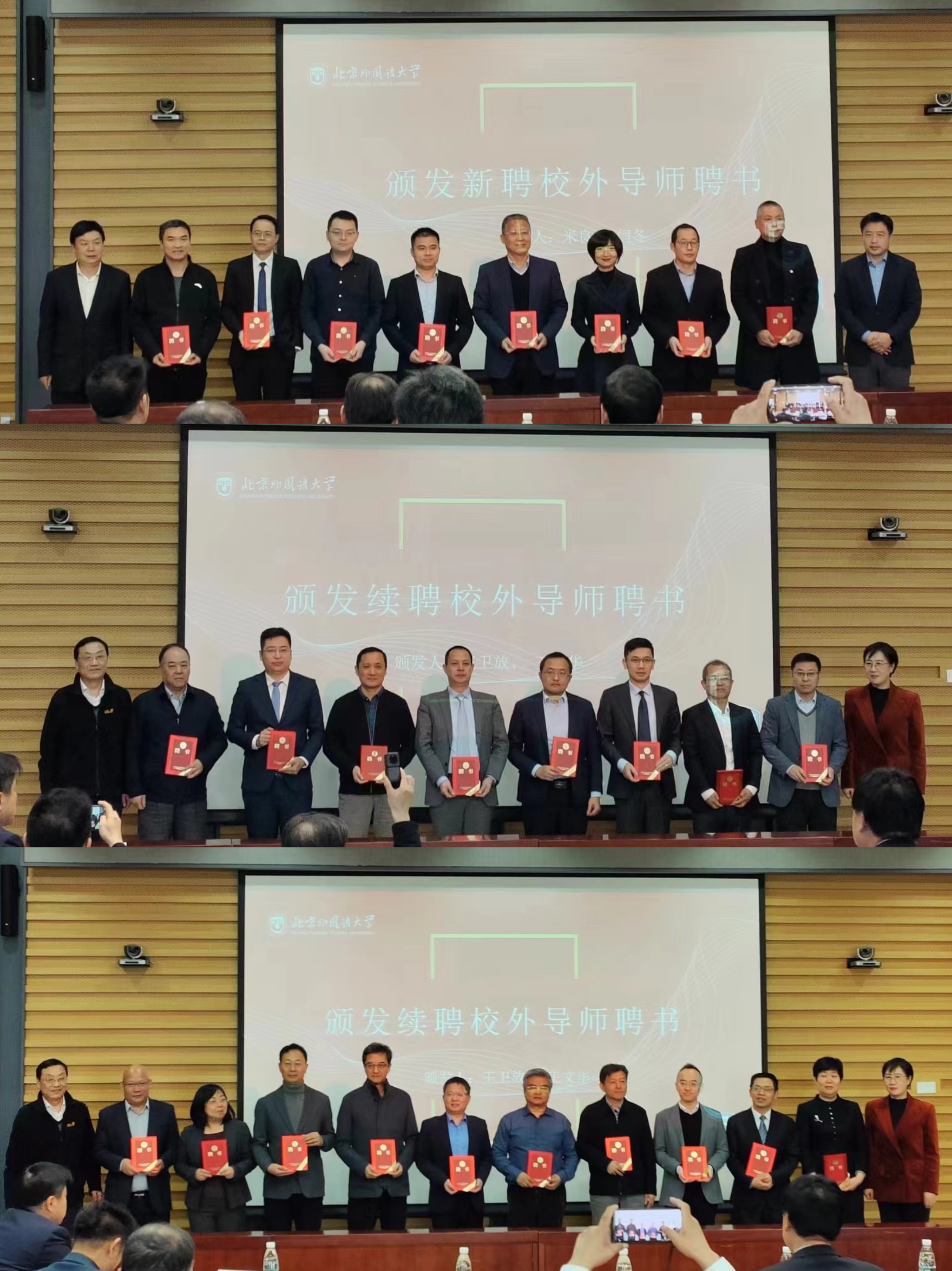 随后,米良院长和闫冬副院长为新聘校外导师颁发聘书,王卫放书记和王文华教授为续聘校外导师颁发聘书。此次聘任的校外导师来自政府部门、律所及企事业单位法务部门等领域,具有丰富的实践经验和学术造诣。他们将为beat365官方网站研究生提供更加丰富多样的学术指导和实践支持,助力研究生全面发展。
