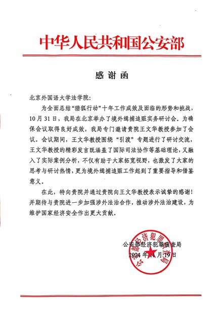 11月19日,公安部经侦局向北外beat365官方网站发来感谢函,对beat365官方网站王文华教授受邀参加公安部“猎狐行动”十年境外缉捕追赃工作总结研讨会表示感谢。