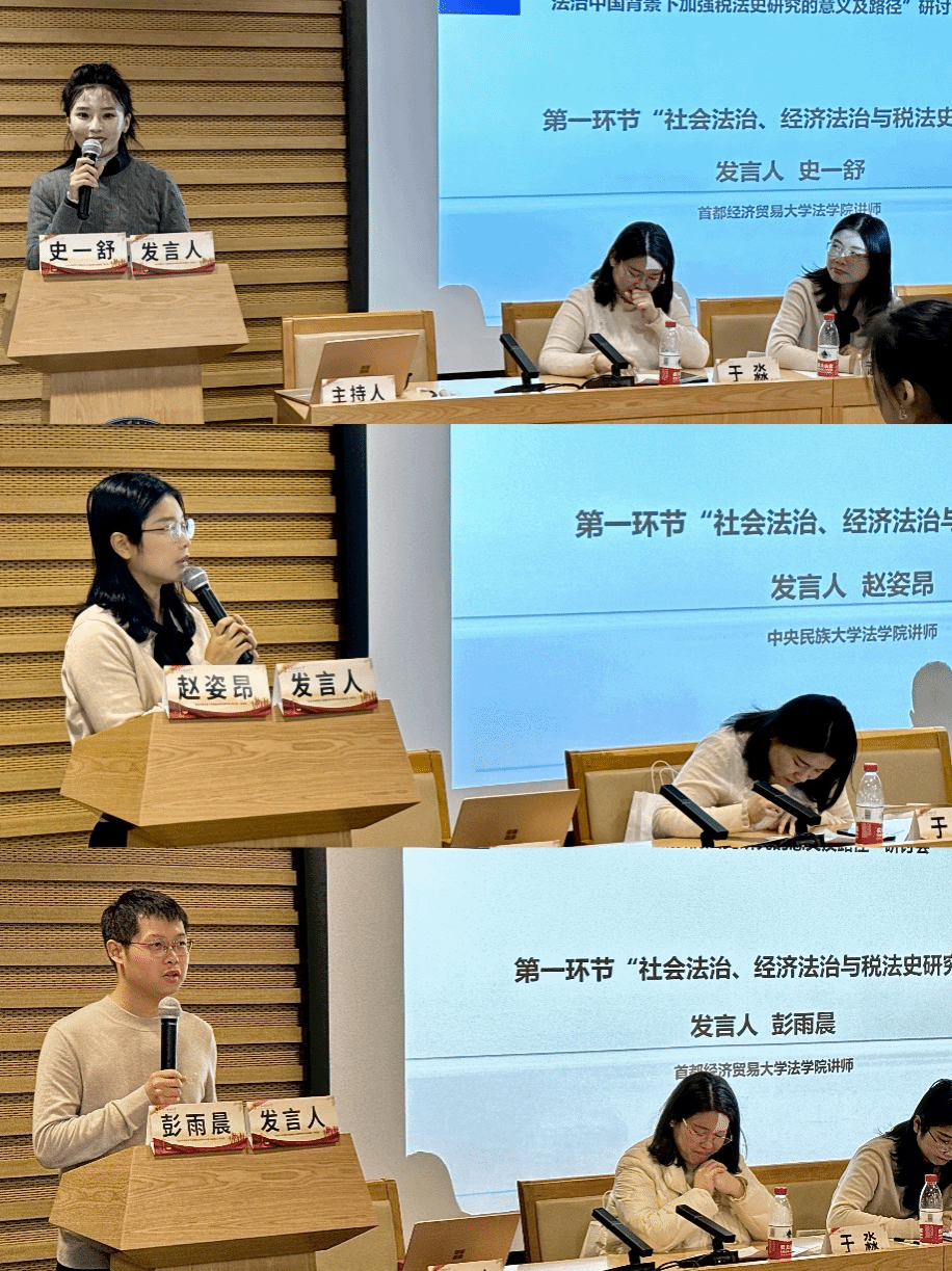 会议的第一环节由首都经济贸易大学副教授胡翔老师主持,各学者围绕“社会法治、经济法治与税法史研究”这一中心主旨发表了真知灼见。赵申豪副教授以土地税为类比点,从限制数据垄断是否需要数据课税这一视角探讨税法史。庞湃老师从唐宋的两税法、宋朝的市舶法、商税三个税种入手提出古代税法对现代税法的历史借鉴。于淼老师从领域法学的视角出发,从三个部分探讨在法治中国的背景下,对税法史的研究不仅是对税收制度演变的深刻洞察,也是为当前以及未来法治建设提供了宝贵的知识支撑。
