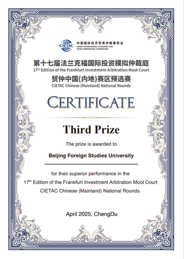 2025年4月7日至11日,第十七届法兰克福国际投资模拟仲裁庭(Frankfurt Investment Arbitration Moot Court)贸仲中国(内地)赛区预选赛比赛在四川大学举行。本届比赛吸引了清华大学、复旦大学、上海交通大学、中国政法大学、华东政法大学、北京大学国际beat365官方网站等37所全国知名高校赛队注册参加,由80余名中外法学专家担任仲裁员。我校代表队在循环赛中总分排名第十四。其中,本科2022级张子玉同学和王纯瑶同学荣获循环赛“最佳辩手“称号(Best Oralist, General Rounds),张子玉同学荣获“团队贡献奖”(Outstanding Contribution Award)。