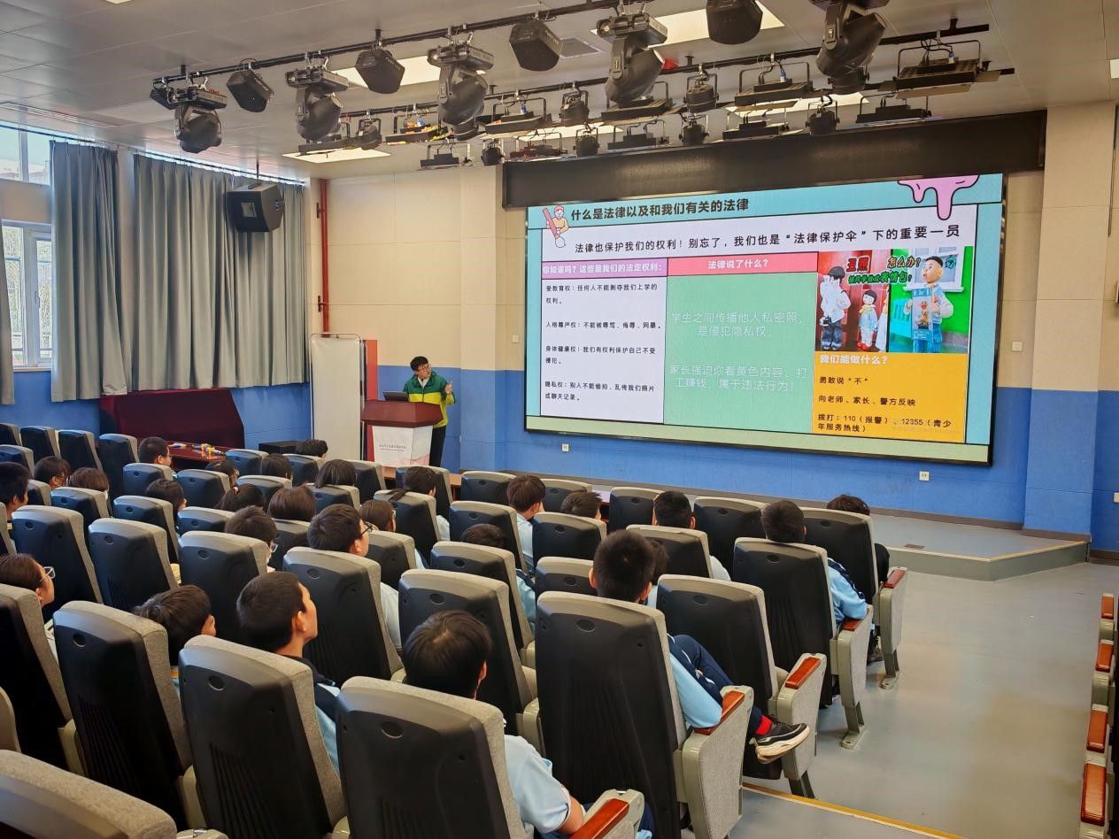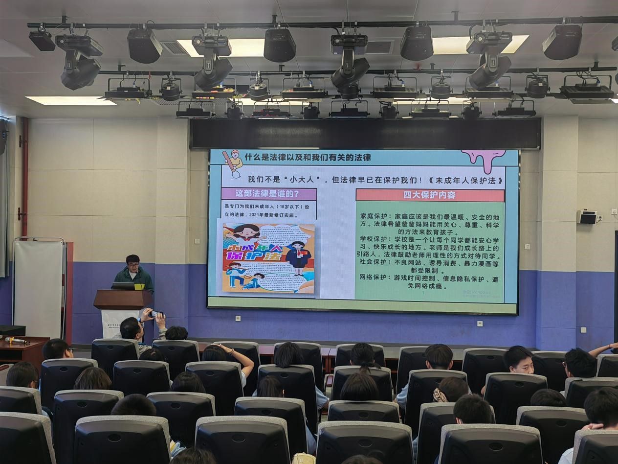 活动伊始,志愿者代表以轻松亲切的方式与同学们交流,引导大家思考“法律在我们生活中扮演什么角色”,随后,志愿者以《未成年人保护法》《预防未成年人犯罪法》等重点法律法规为核心,紧密结合学生的学习生活实际,着重围绕校园欺凌防范、网络安全保护、四大保护内容以及如何自我保护等关键方面展开详细讲解。