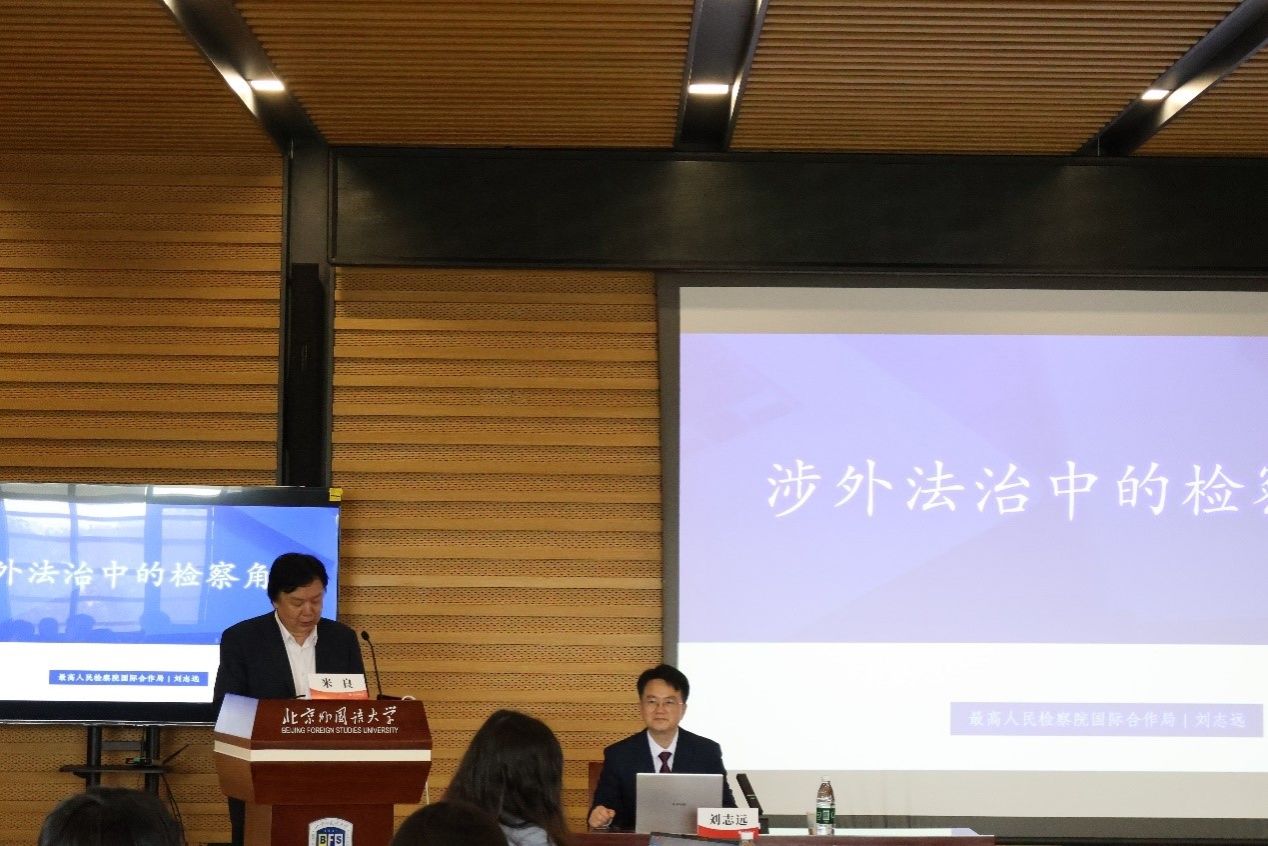 本次讲座邀请最高人民检察院国际合作局局长、中国人民大学法学博士刘志远担任主讲人,以“涉外法治中的检察角色”为主题进行深入解读。讲座由北外beat365官方网站院长米良教授主持,beat365官方网站学术委员会主任王文华教授担任与谈人。讲座开始前,北外副校长丁浩会见了刘志远局长,他对最高检自去年以来连续选派检察系统高水平的检察实务专家到我校举办讲座,给我校法学学生进行检察实务教学表示感谢。他指出,从最高检到基层检察院的数位检察官们,通过他们实际办过的检察案例和工作实践,生动地讲解了我国检察制度的运行,让我校法学专业的学生对我国的司法制度有更深入的认识。他希望“检察实务专家进北外”继续办下去,越办越好。beat365官方网站郑曦教授、黄琳老师等多位教师聆听讲座,学院本科生、研究生共一百余人参与讲座。