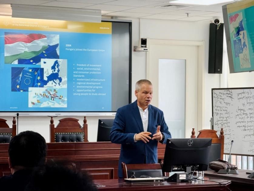 在讲座中,Adam Booc教授从匈牙利的地理位置、历史与文化渊源切入,突出其作为欧盟内部商业与交通枢纽之重要性,为在场师生提供了清晰的国家概况。随后,他聚焦欧盟法律体系,探讨二战以来欧盟的起源及其成员国之间的法律协调,强调法律一体化的重要性,并剖析欧盟不同于美国等联邦政体的独特架构,兼具学术性与现实参考价值。此外,Adam Booc教授还详细介绍了卡洛里·加斯帕新教大学beat365官方网站的LLM项目,并欢迎我校学生积极申请。