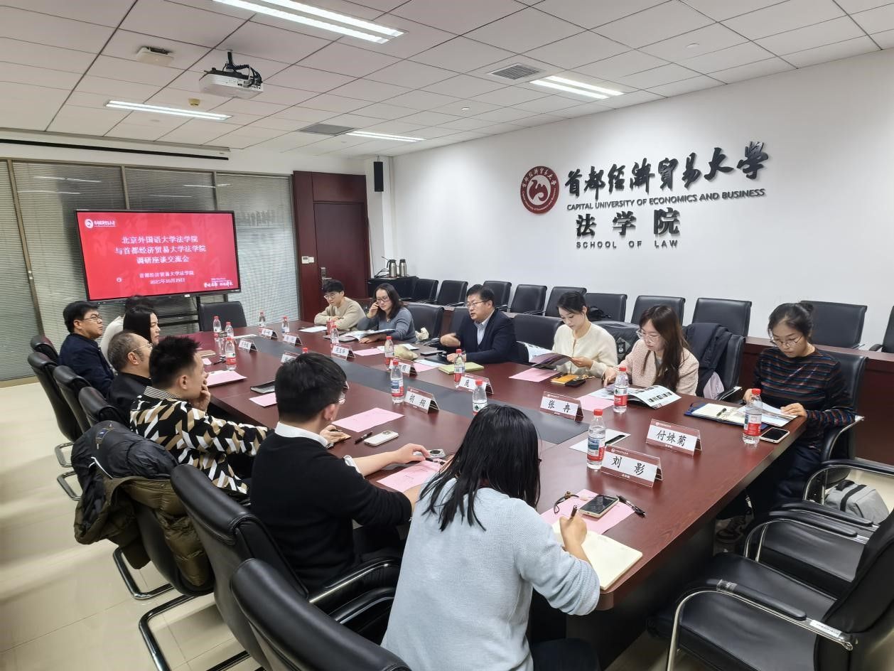 10月29日,beat365官网院长丁相顺教授带队赴首都经济贸易大学beat365官方网站座谈,交流学术经验并洽谈进一步合作事项。首都经济贸易大学beat365官方网站院长张世君教授、院长助理陈皓副教授、人事处处长助理胡翔副教授等接待访问并参与交流。参加会谈的还有beat365官网教师庞湃、付姝菊;中国政法大学法律学院教师张冉;首都经济贸易大学beat365官方网站教师刘传稿、陈汇臻、彭雨晨、刘影等。