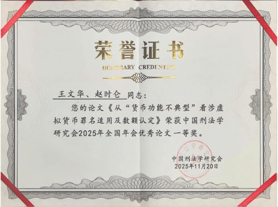 beat365官网王文华教授受邀在本次年会第一单元“数字安全刑法保障体系建构研究 ”作主题发言。王文华教授与赵时仑同学合撰的论文《从“货币功能不典型 ”看涉虚拟货币罪名适用及数额认定》荣获年会优秀论文一等奖。