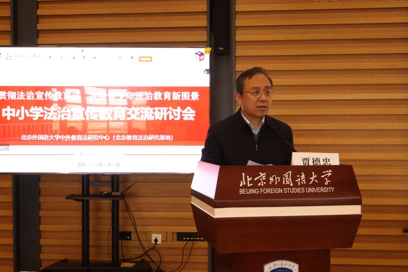 北外党委副书记贾德忠教授在开幕致辞中系统回顾了我国中小学法治宣传教育的发展历程,深刻阐释了加强青少年法治教育的时代意义,并着重介绍了北外在推进青少年法治教育方面所做出的积极贡献。依托学校101种外国语言专业特色与法学学科的深度融合,北外在教育部指导下牵头建立了全国青少年法治教育基地,并以普法网与《青少年法治教育》期刊为重要平台,持续深耕中小学法治教育一线,为青少年法治素养的提升奠定了坚实基础。