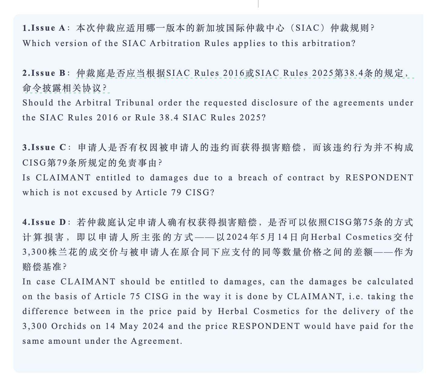 2025年10月10日赛题发布,今年的赛题紧扣国际贸易与生态保护领域的热点问题。实体部分适用《联合国国际货物销售合同公约》(CISG)、《国际商事合同通则》(PICC)和《濒危野生动植物种国际贸易公约》(CITES)的规定,涉及因涉及因濒危植物香草兰花(Vanilla Orchid)被纳入 CITES 附录而导致合同履行受阻并引发的赔偿责任纠纷;程序方面则适用2025年最新修订的《新加坡国际仲裁中心仲裁规则》,涉及仲裁规则版本的适用争议、多层次争议解决机制的衔接问题,以及因第三方资助所引发的披露义务相关争议。参赛选手需将目光往返于机构仲裁规则意志和当事人意思自治的冲突中、在商事争议解决效率和公正性之间寻求平衡,寻找支撑论点的案例和学说。