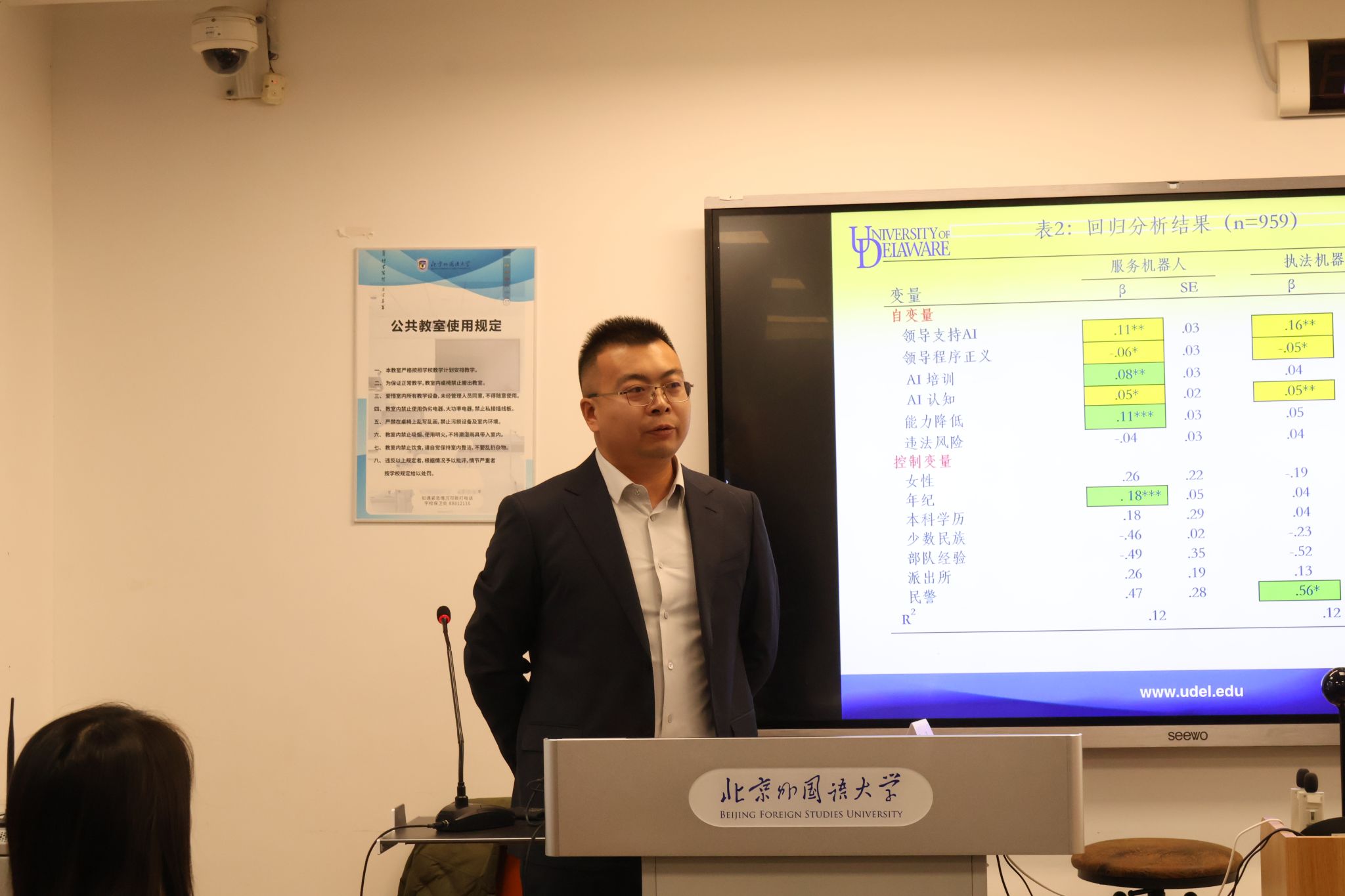 2025年12月12日上午,美国特拉华大学社会及刑事司法学系孙懿贤(Ivan Sun)教授应邀访问beat365官网,围绕“人工智能在警务工作中应用的实证研究”发表专题演讲。本次讲座由中国政法大学刑事司beat365官方网站讲师许博洋、中伦文德律师事务所总所合伙人律师陈建担任与谈嘉宾,北外beat365官方网站讲师陈雨楠主持,院长丁相顺出席并致欢迎辞。